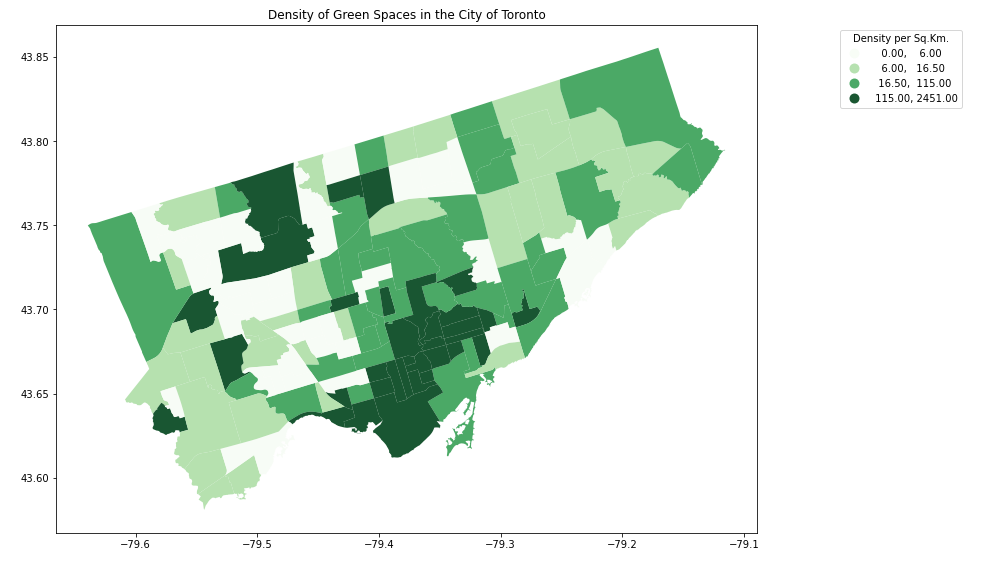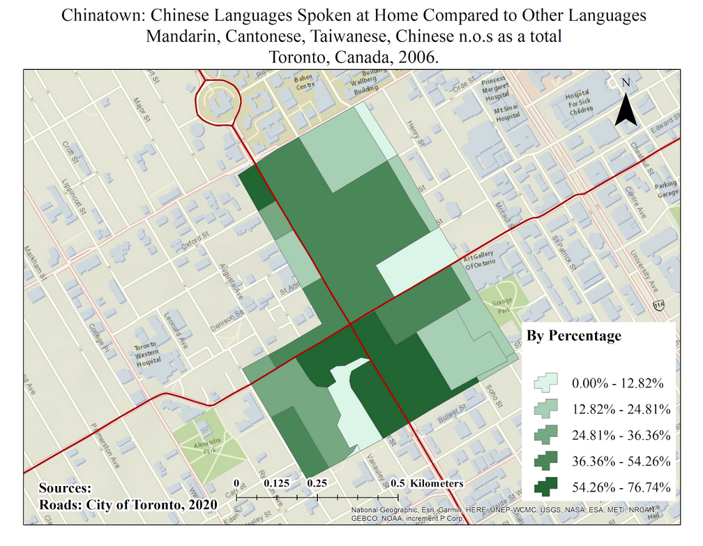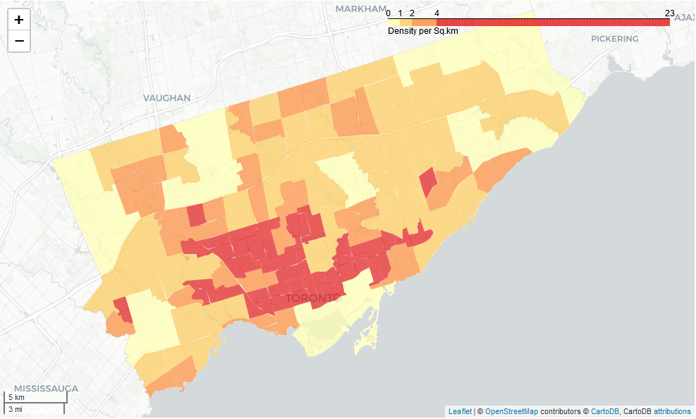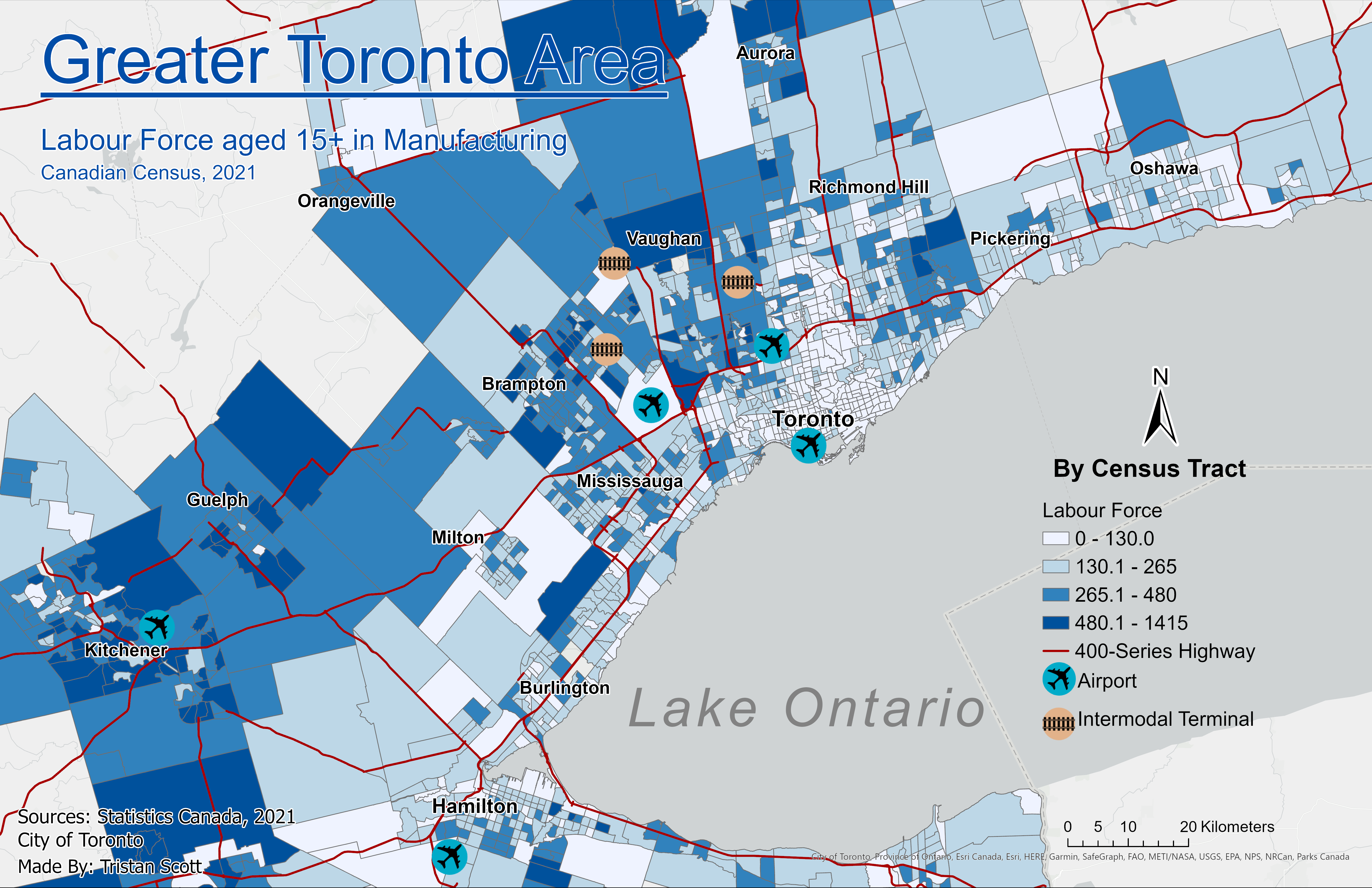A chloropleth map depicting counts of the GTA's labour force in the area's manufacturing sector, ages 15 and above.